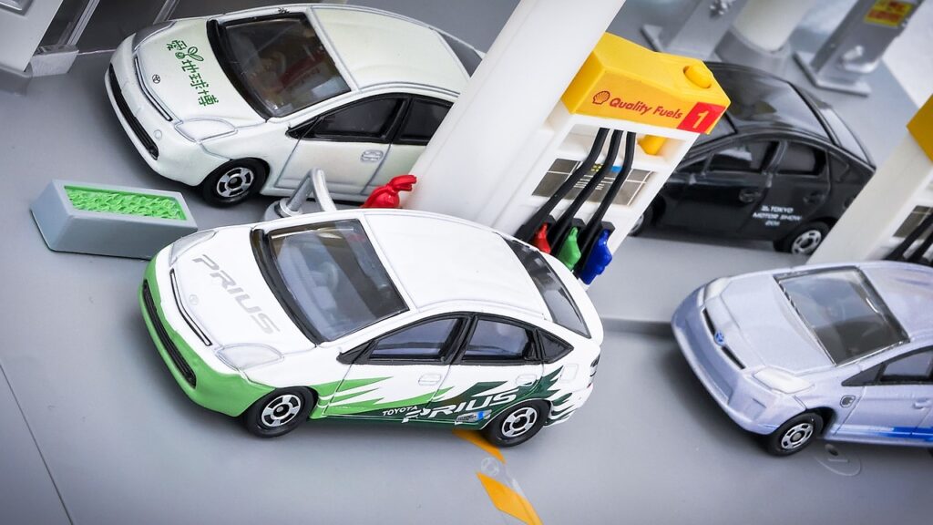 給油シーンを再現したプリウスの模型。ハイブリッド車の構造を理解するうえでイメージしやすい。